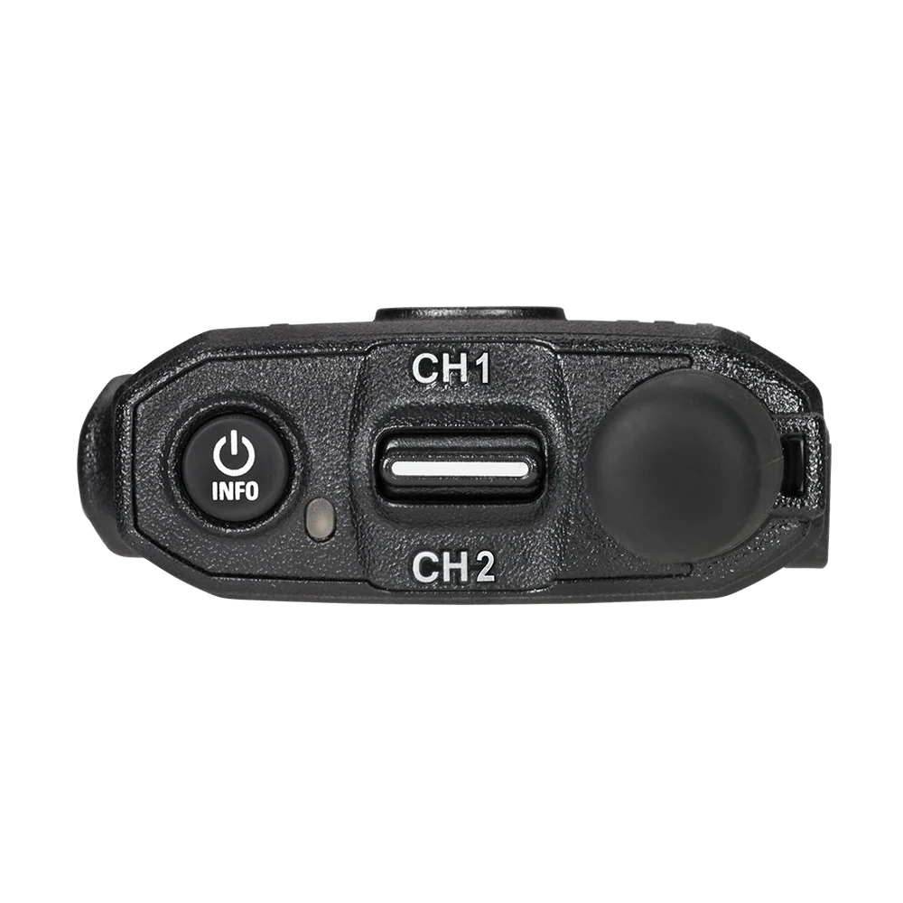 VHF Max Range digital pocket radio with micro-USB charging port, stubby antenna, and up to 15 hours of battery life.